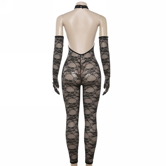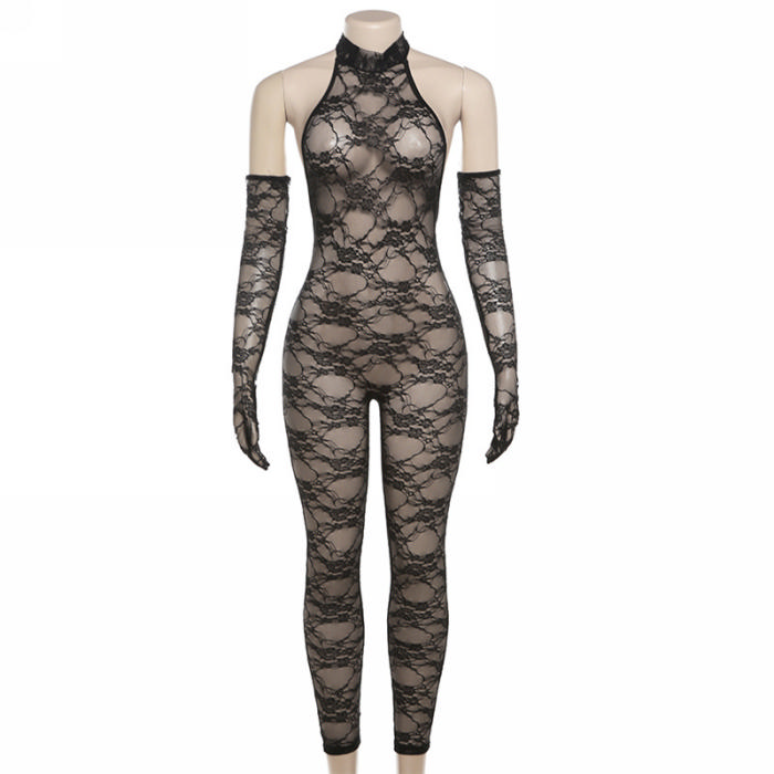(Real Image)2024 Styles Women Summer Fashion Halter Neck Sexy Backless Sheer Mesh Slim-Fit JumpsuitSKU: #CF77806-1