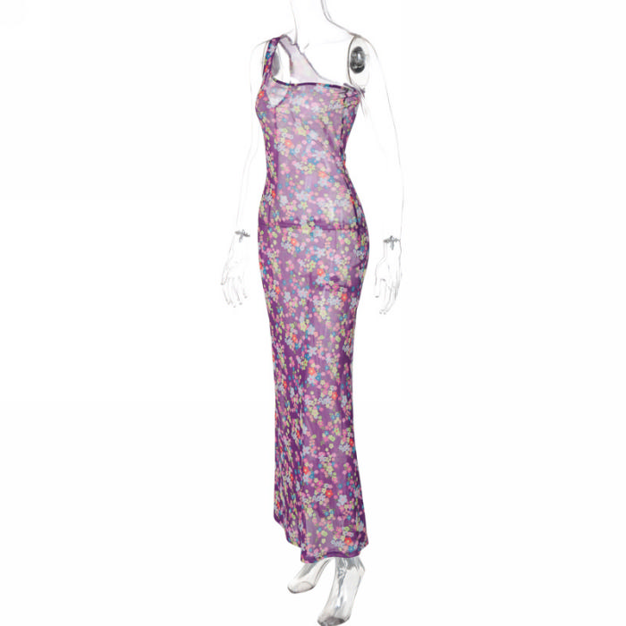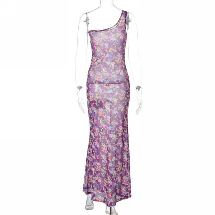 (Real Image)2024 Styles Women Summer Fashion Mesh Print Slim One-Shoulder Sleeveless Maxi DressSKU: #CF88239-1