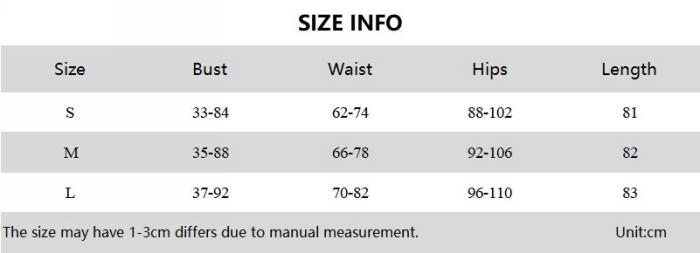 | Size | Bust | Waist | Hips |