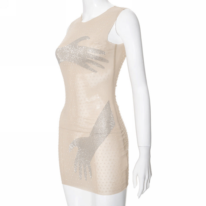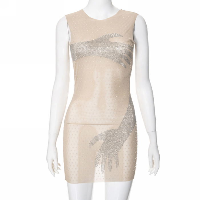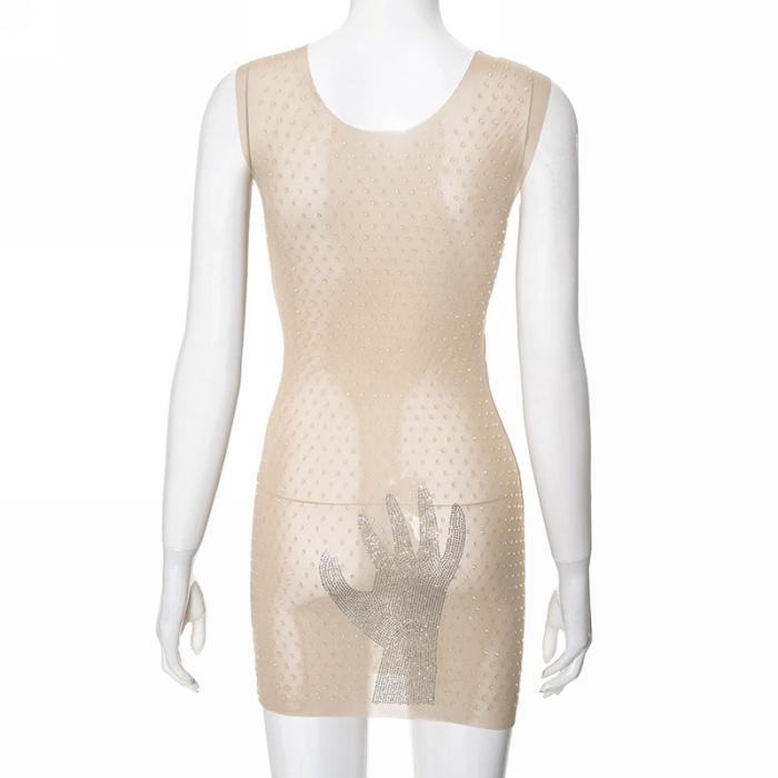 (Real Image)2024 Styles Women Summer Fashion Sexy Mesh Spliced Round Neck Sleeveless Rhinestone Mini DressSKU: #CF47922-1