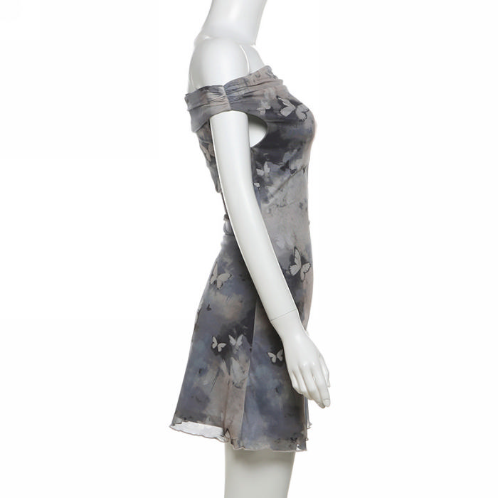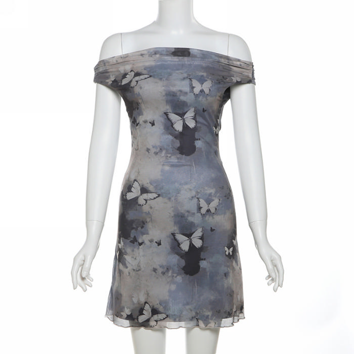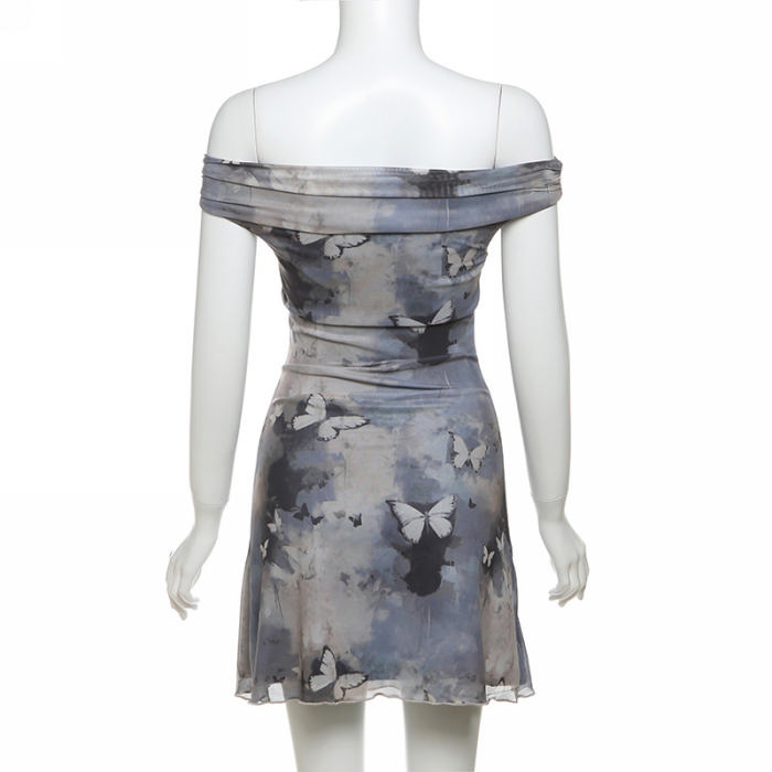 (Real Image)2024 Styles Women Summer Fashion Slimming Off-Shoulder Butterfly Print DressSKU: #CF77772-1