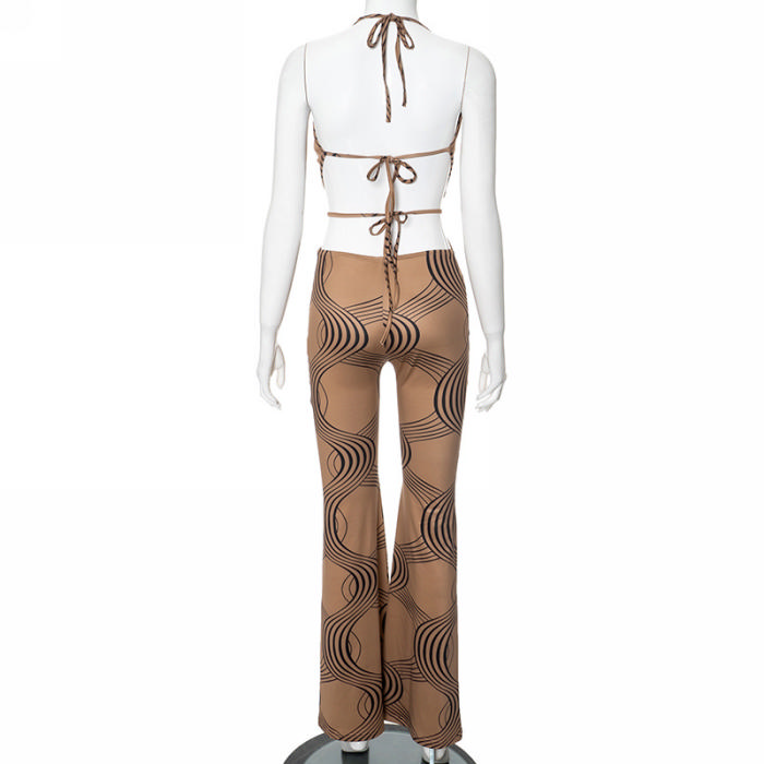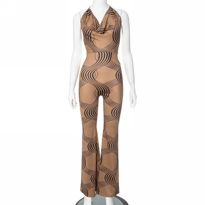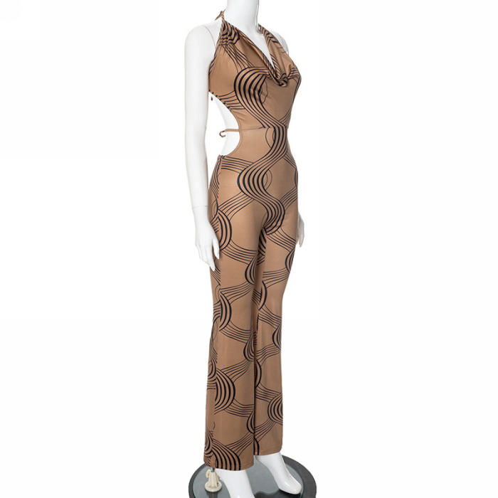 (Real Image)2024 Styles Women Summer Fashion Stripe Print Sleeveless Halter Tie-Back Cutout JumpsuitSKU: #CF47914-1