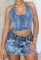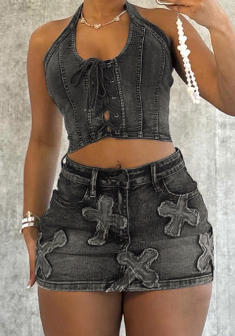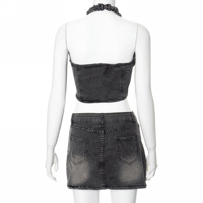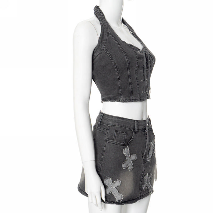 (Real Image)2024 Styles Women Summer Halter Eyelet Strappy Cross Washed Distressed Casual Dress SetSKU: #CF47902-1