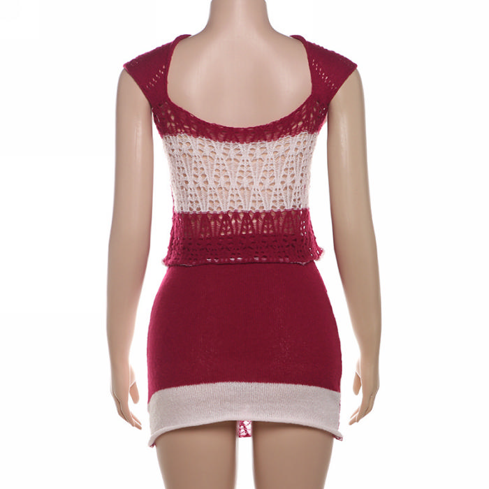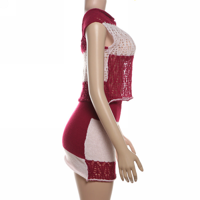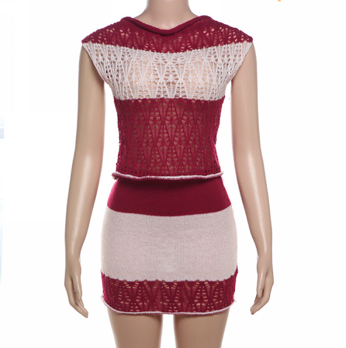 (Real Image)2024 Styles Women Summer Knitted Color-Blocked Sleeveless Fashion Sexy Sheer Pencil Skirt SetSKU: #CF83349-1
