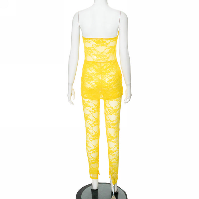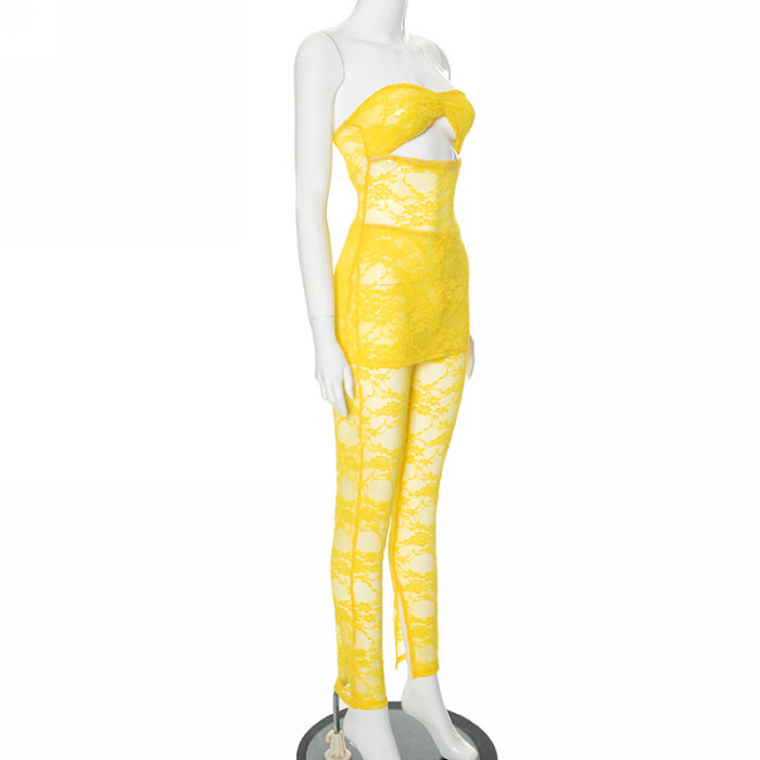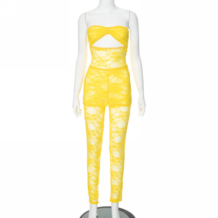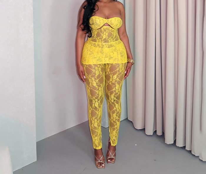 (Real Image)2024 Styles Women Summer Lace Hollow Out Off-Shoulder Bustier Crop Top and Wide Leg Pants SetSKU: #CF47928-1