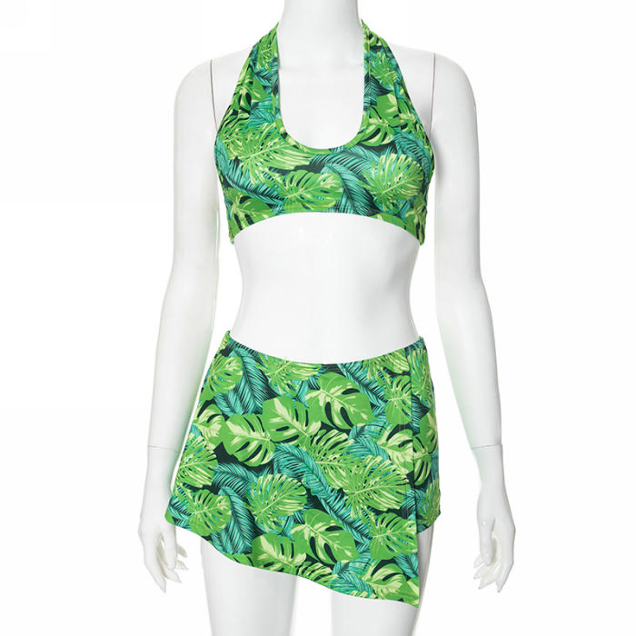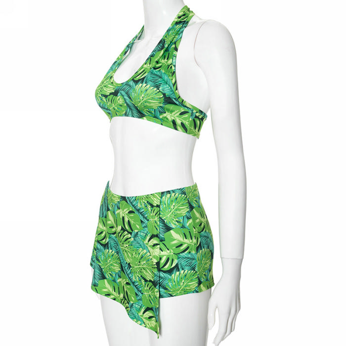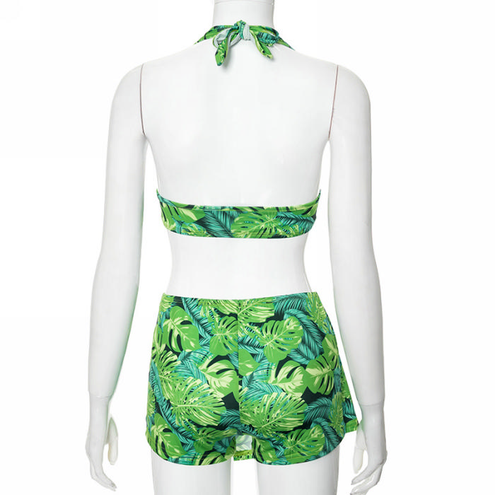 (Real Image)2024 Styles Women Summer Leaf Print Sleeveless Halter Top with Stretch Shorts Skirt SetSKU: #CF478751