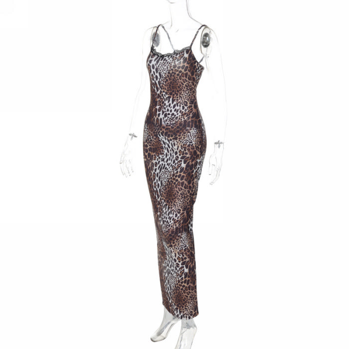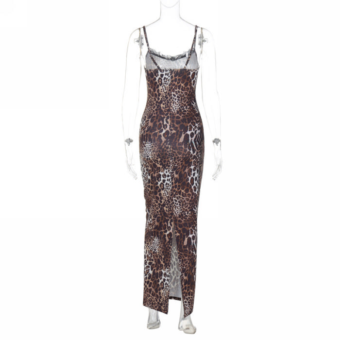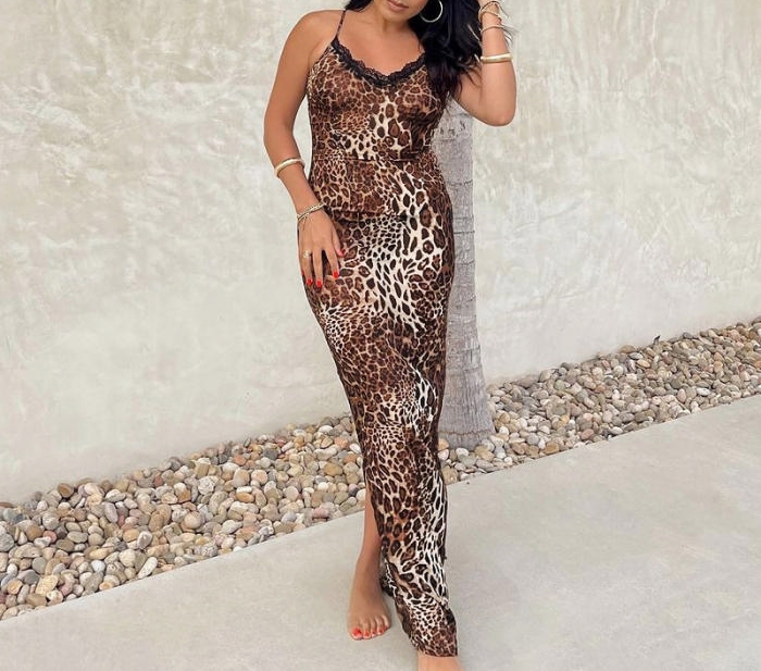 (Real Image)2024 Styles Women Summer Leopard Print Lace Trimmed Back Split Long Halter Maxi DressSKU: #CF88234-1