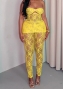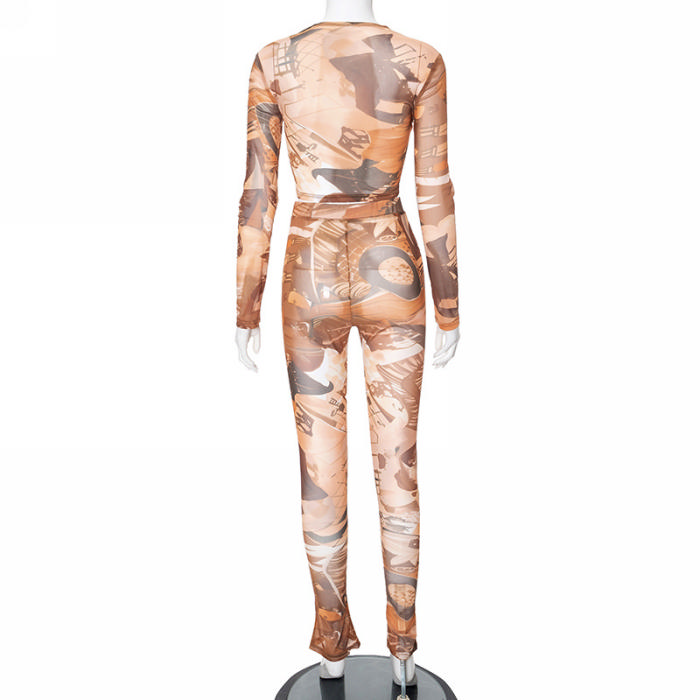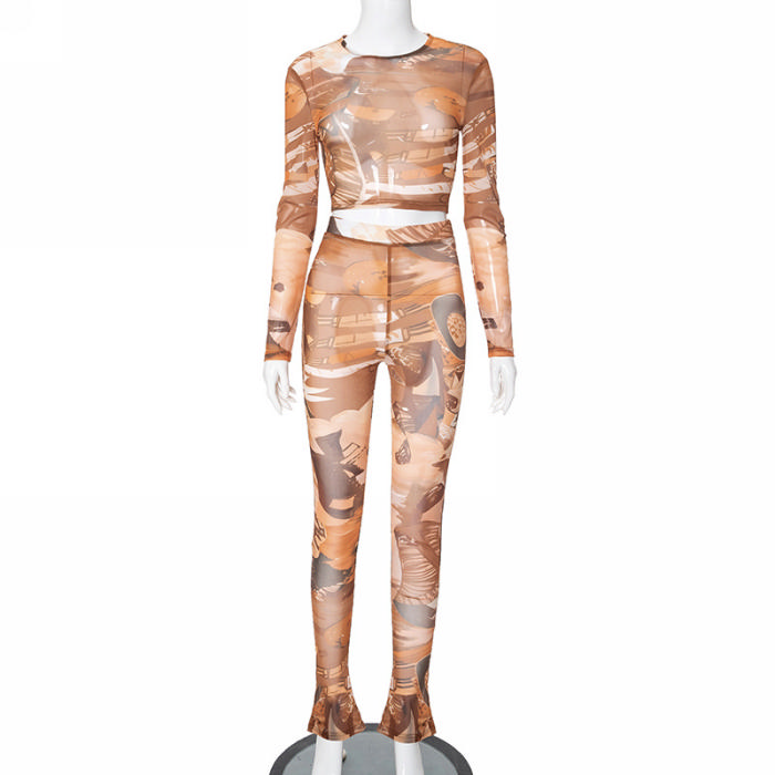 (Real Image)2024 Styles Women Summer Mesh Floral Print Round Neck Long Sleeve Top and Casual Pants Two Piece SetSKU: #CF47920-1
