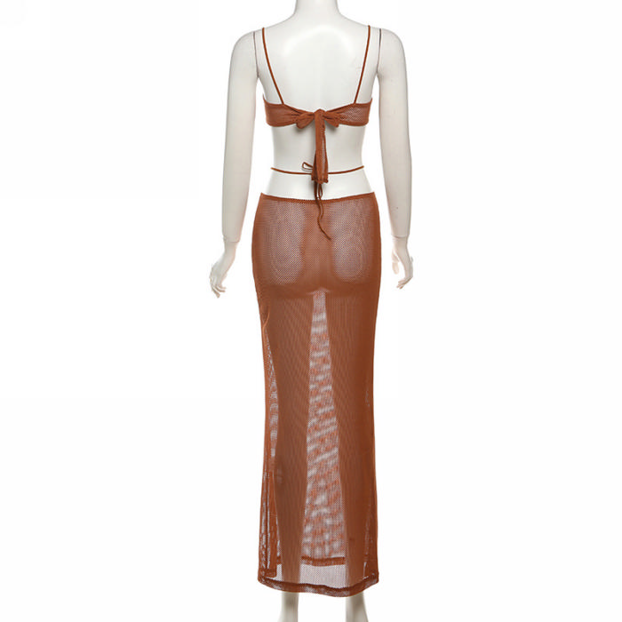 (Real Image)2024 Styles Women Summer Sexy Sheer Lace-Up Top with Low Waist Slim-Fit Skirt SetSKU: #CF77796-1
