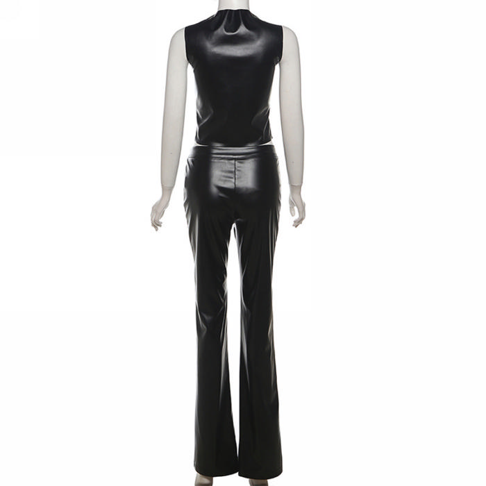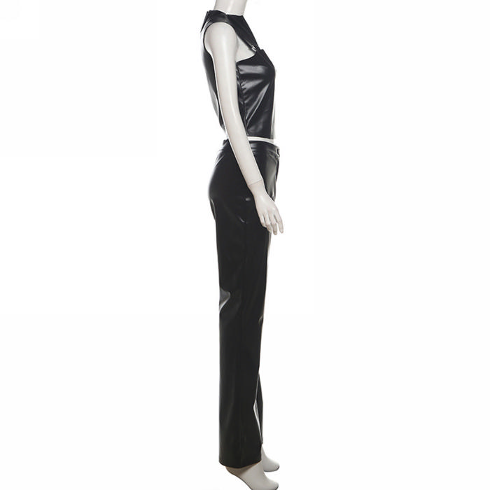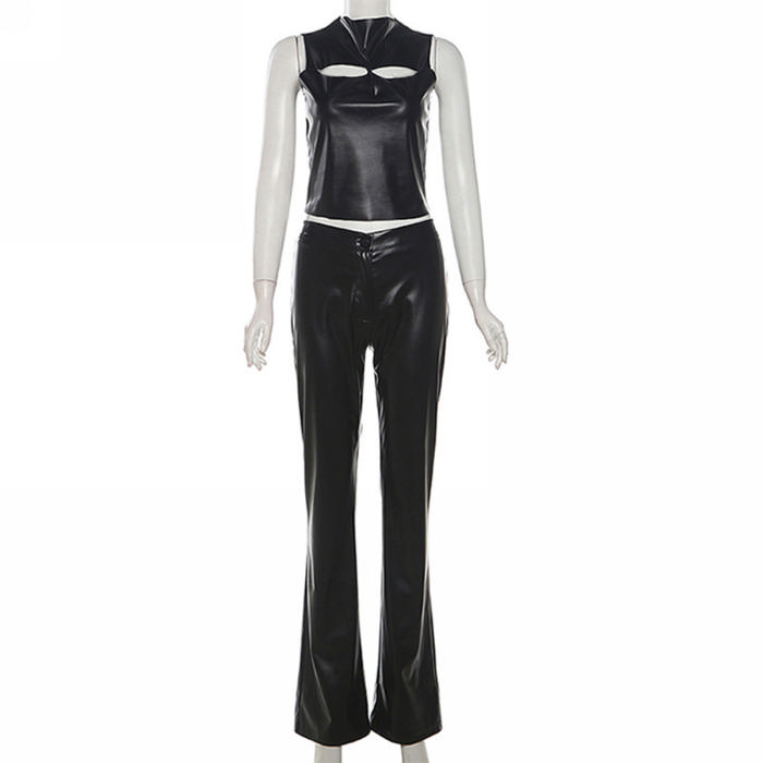 (Real Image)2024 Styles Women Summer Sleeveless Hollow-Out PU Top with High-Waist Hip-Wrap Straight Casual PantsSKU: #CF77819-1