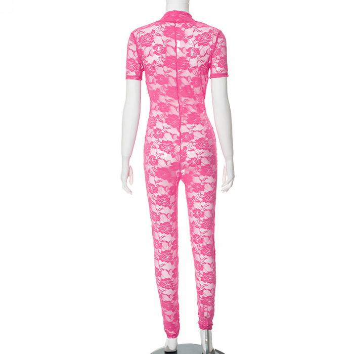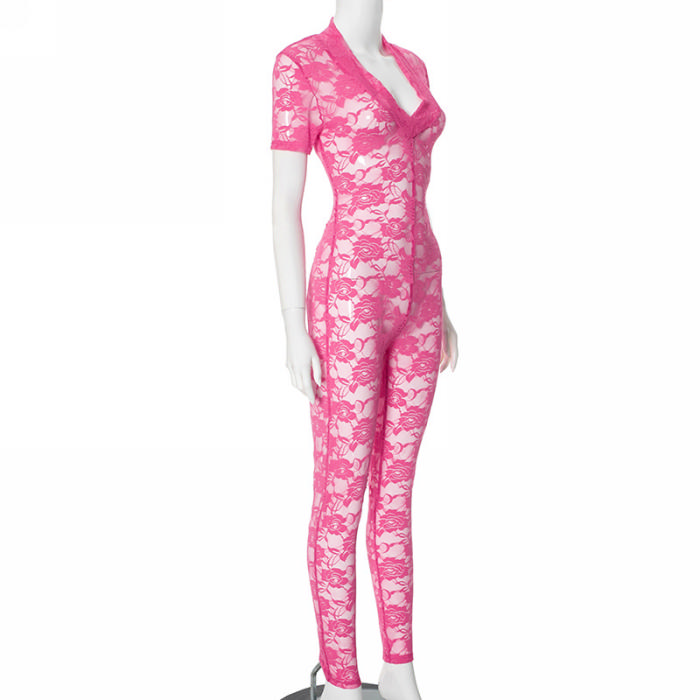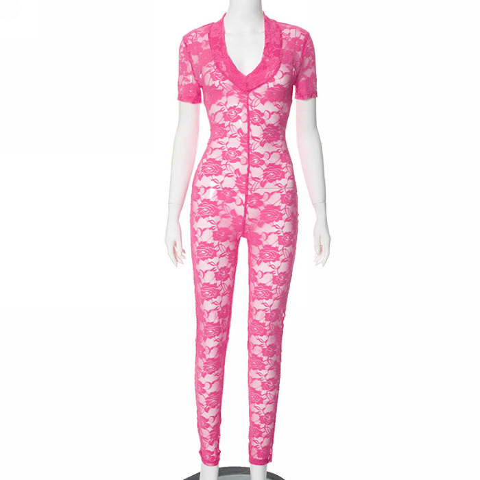 (Real Image)2024 Styles Women Summer Solid Color Lace Spliced Deep V-Neck Short Sleeve Bodysuit JumpsuitSKU: #CF47907-1