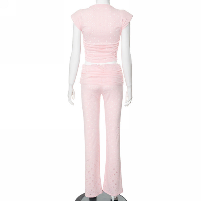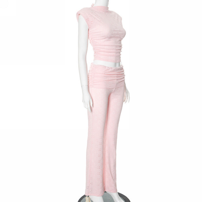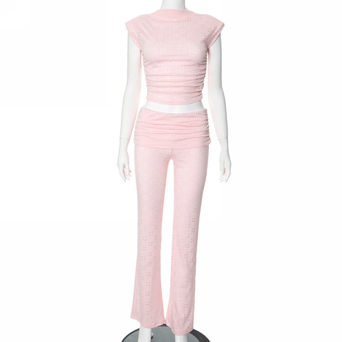 (Real Image)2024 Styles Women Summer Solid Color Sleeveless Crop Top and Fold-Over Waist Wide Leg Pants Casual Two Piece SetSKU: #CF47911-1