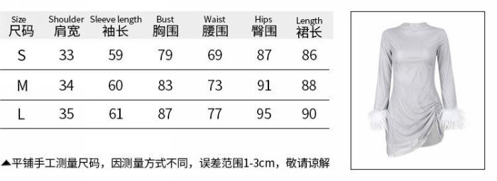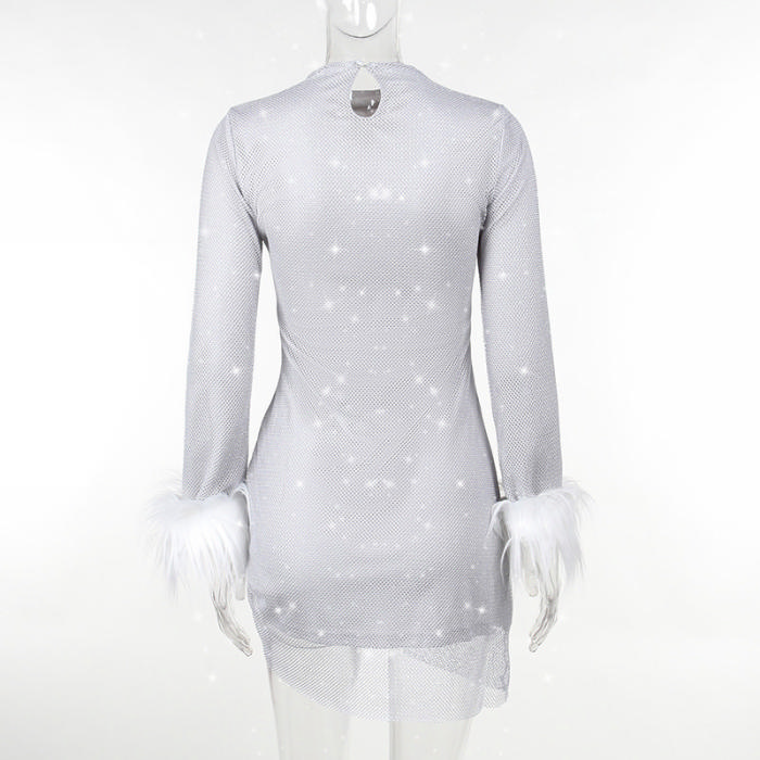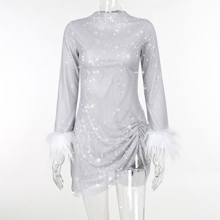 (Real Image)2024 Styles Women Summer Spicy Round Neck Sequined Fuzzy Long Sleeve Sexy Split DressSKU: #XF92858-1