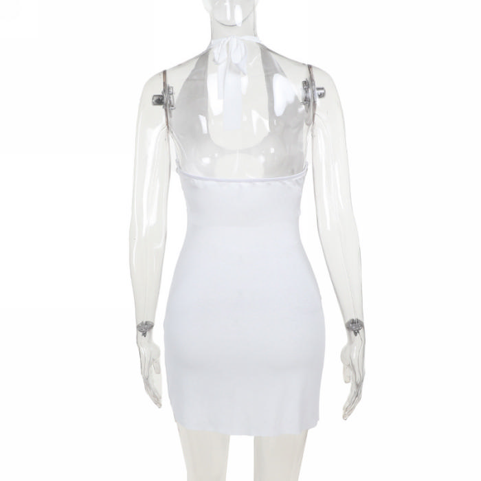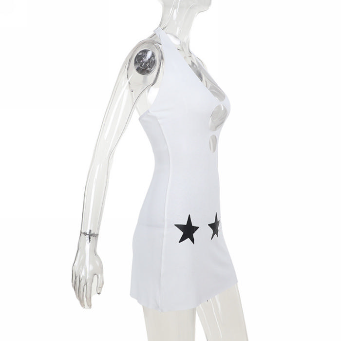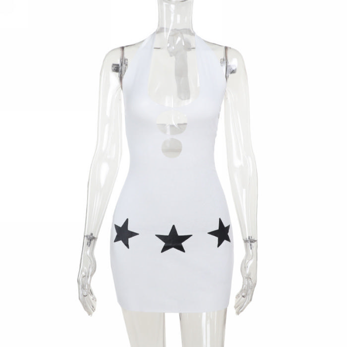 (Real Image)2024 Styles Women Summer Star Print Open-Work Halter Sexy Knitted DressSKU: #XF92882-1