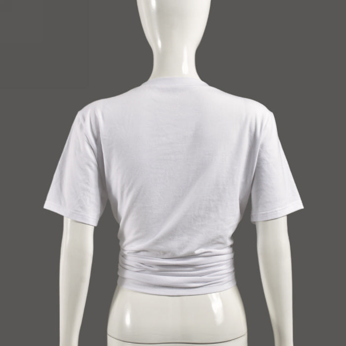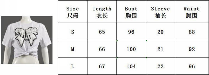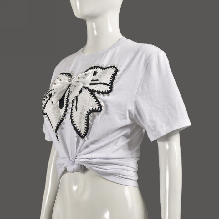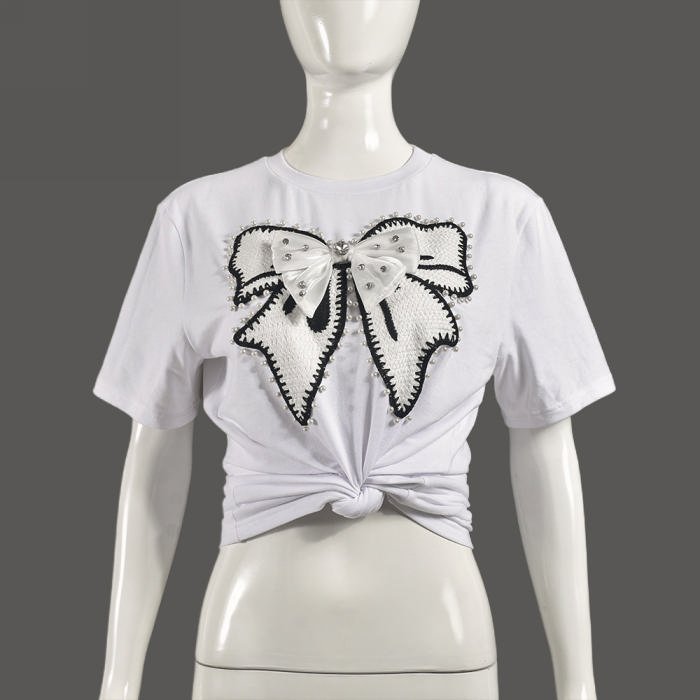 (Real Image)2024 Styles Women Summer Stud-Embellished Patch with Bow Western Style Round Neck T-ShirtSKU: #CF75055-1