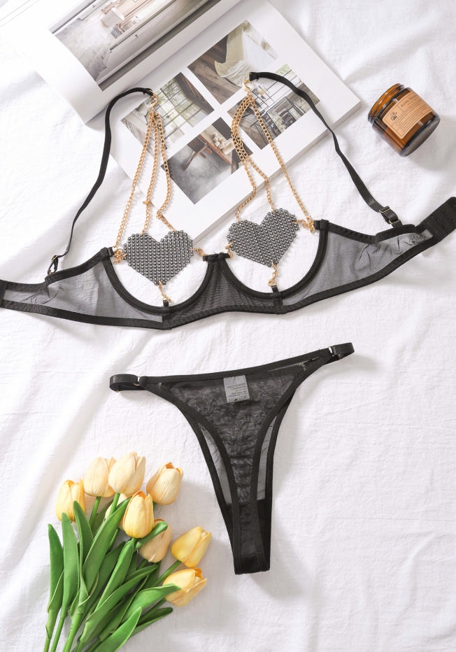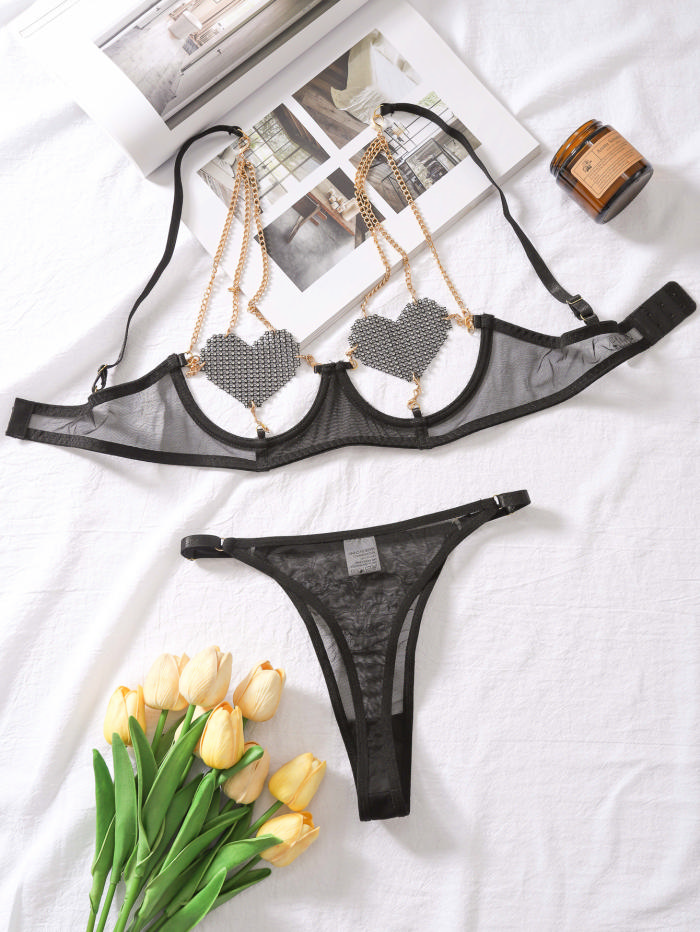 (Real Image)2024 Styles Women Transparent Chest Heart Chain Sexy Sheer Net Mesh Two-Piece SetSKU: #GF02023-2