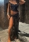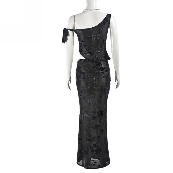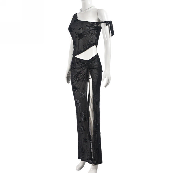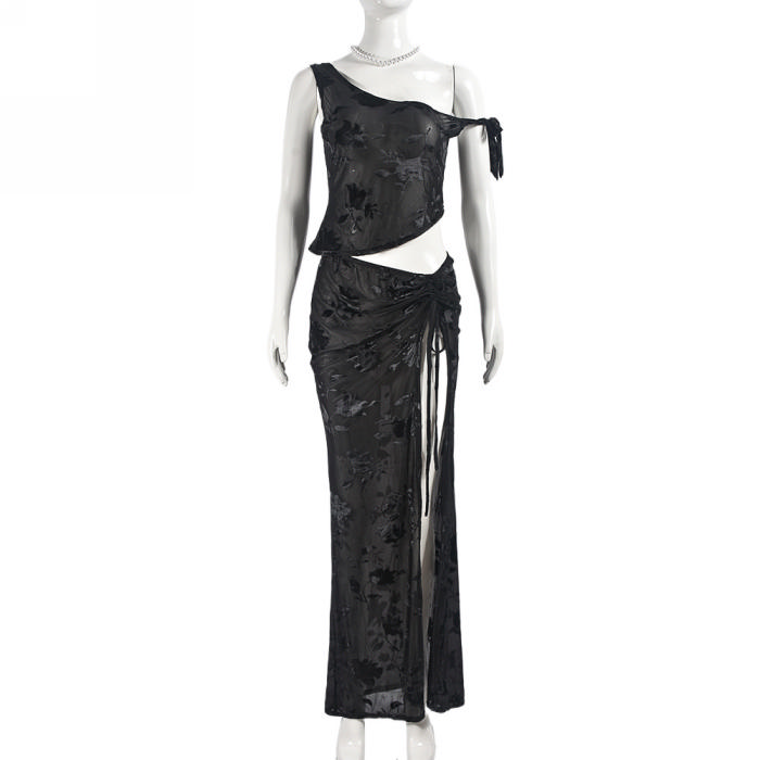 (Real Image)2024 Styles Women Transparent Flocked Lace-Up Crop Top and Skirt SetSKU: #CF59830-1