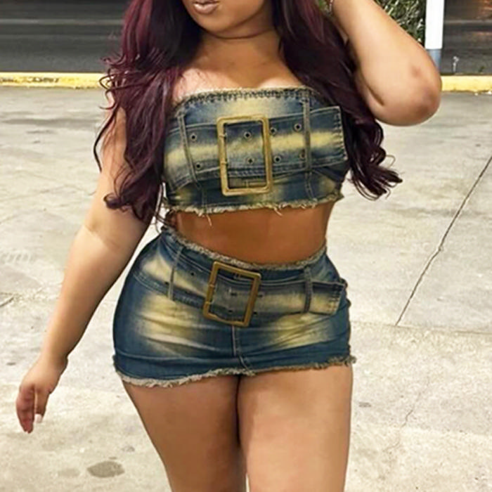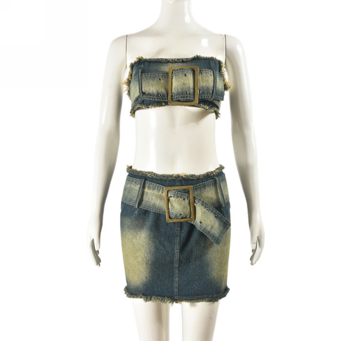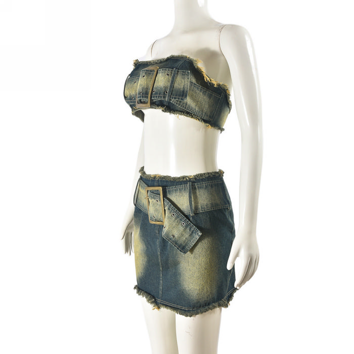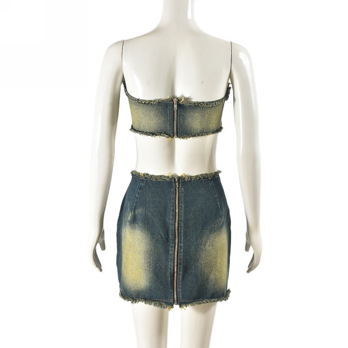 (Real Image)2024 Styles Women Washed-Out Color-Blocked Belted Fringe Halter Mini Dress SetSKU: #CF59812-1
