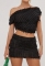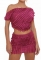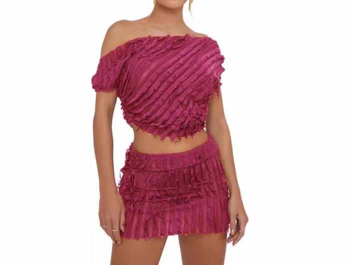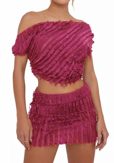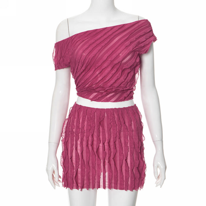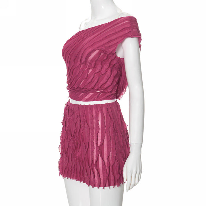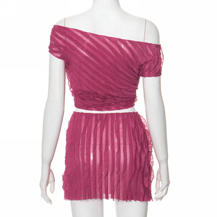 (Real Image)2024 Styles Women Wavy Striped Top with Exposed Back Short Sleeves Sexy Short Skirt Two-Piece SetSKU: #CF92076-1