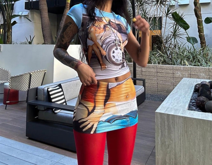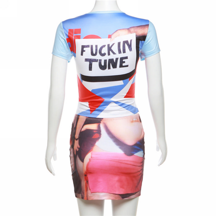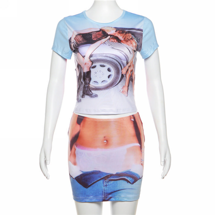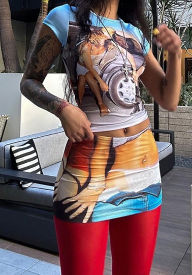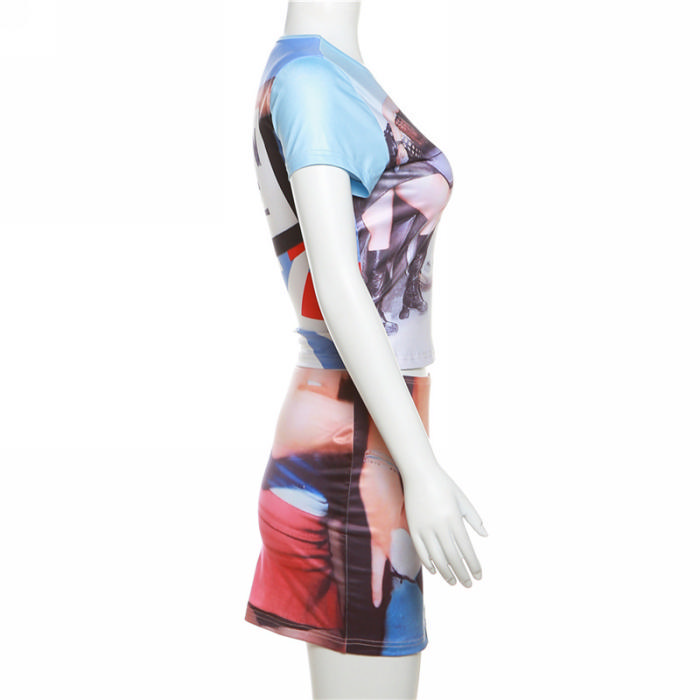 (Real Image)2024 Styles Women's Wear European and American Sexy Crop Top Printed Short Sleeve High Waist Slimming Hip-Wrapped Mini Skirt SetSKU: #CF77761-1