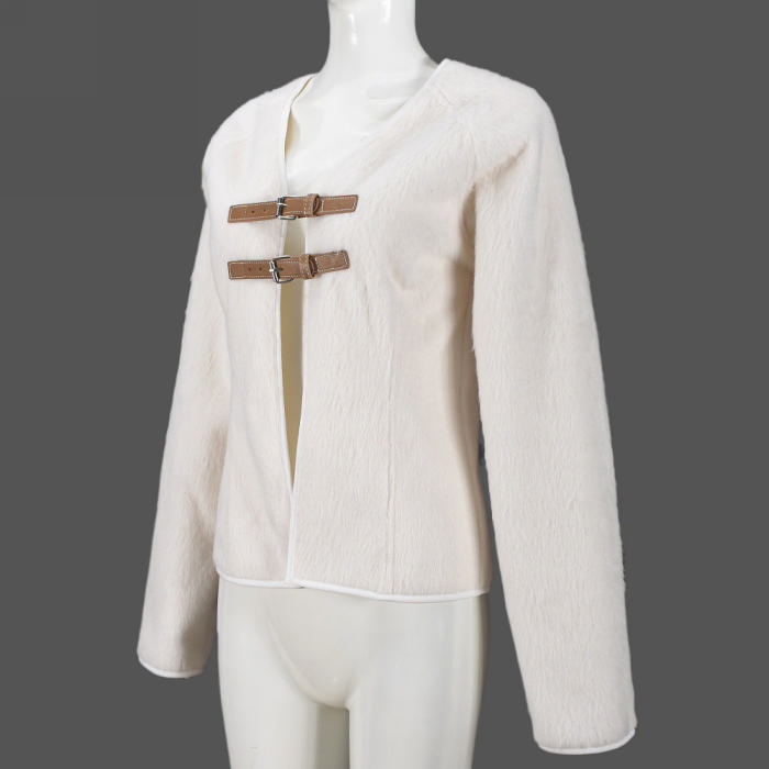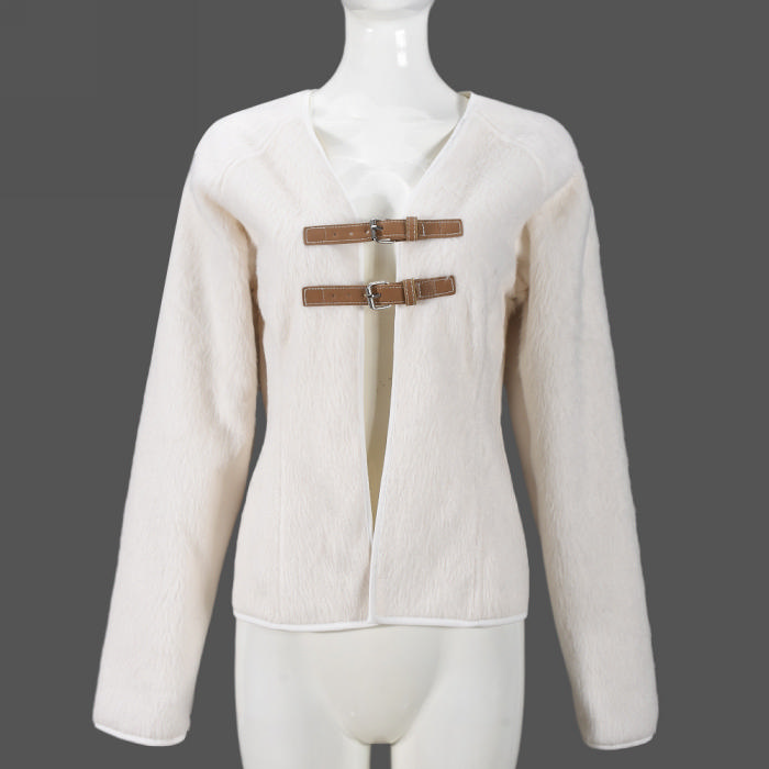 (Real Image,Only Tops)2024 Styles Women Autumn/Winter Wool-Blend Crop Top with Belt Buckle Open Front Long Sleeve JacketSKU: #CF59977-1