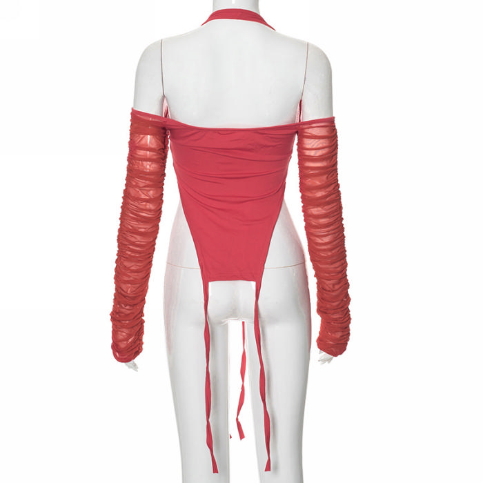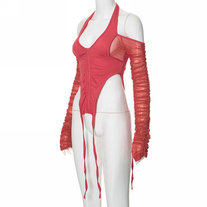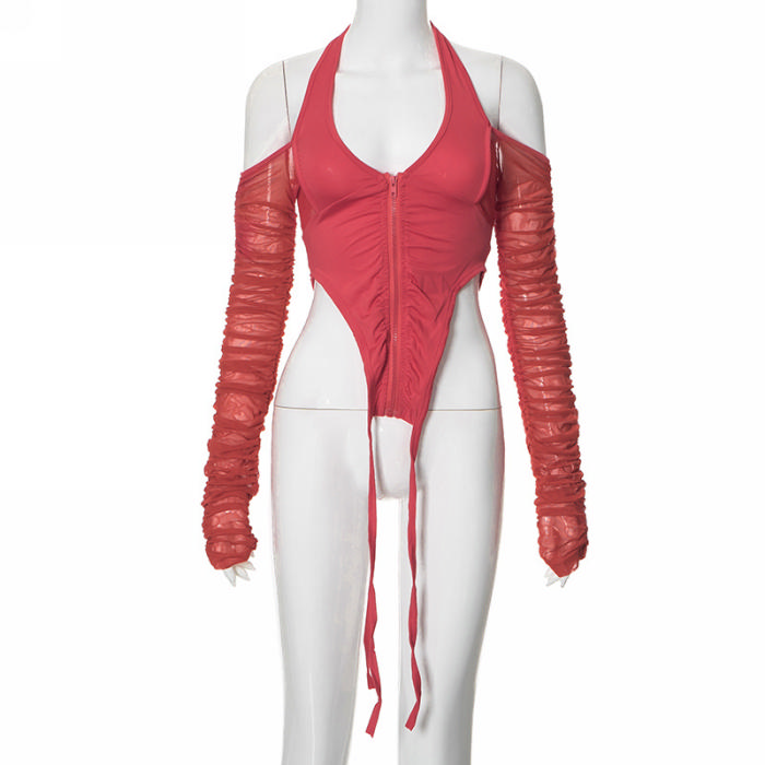 (Real Image,Only Tops)2024 Styles Women Halter Exposed-Back Zip Mesh See-Through Tie-Up TopSKU: #CF92120-2