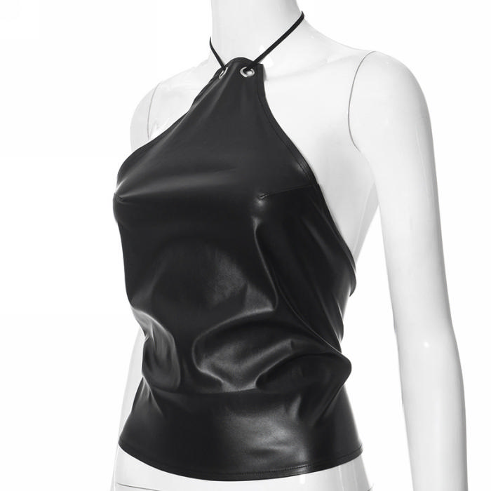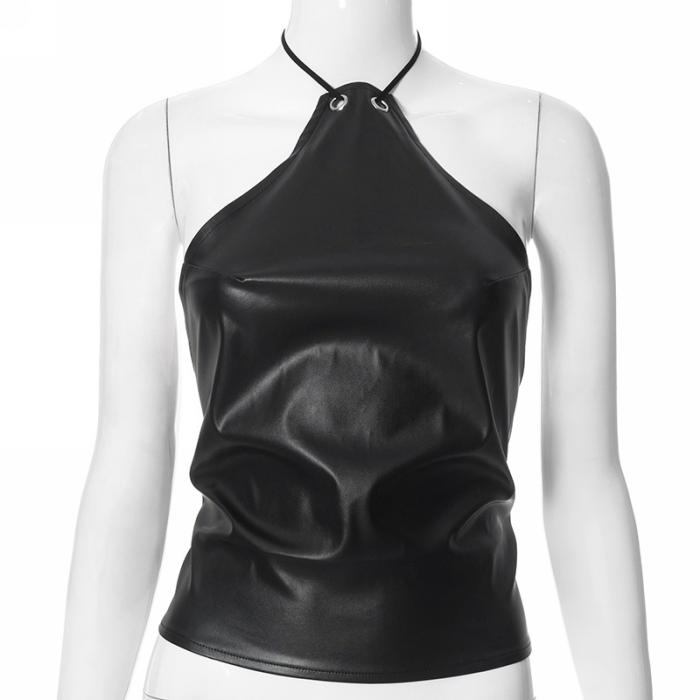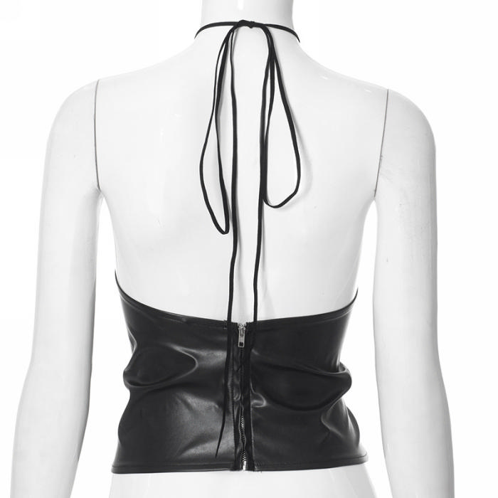 (Real Image,Only Tops)2024 Styles Women Halter Neck Slim Fit Sleeveless Leather VestSKU: #CF92065-1