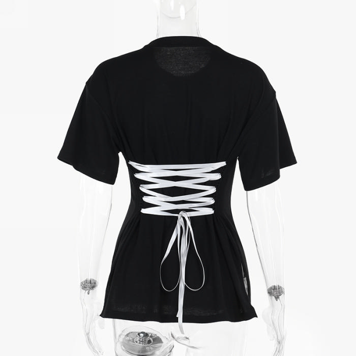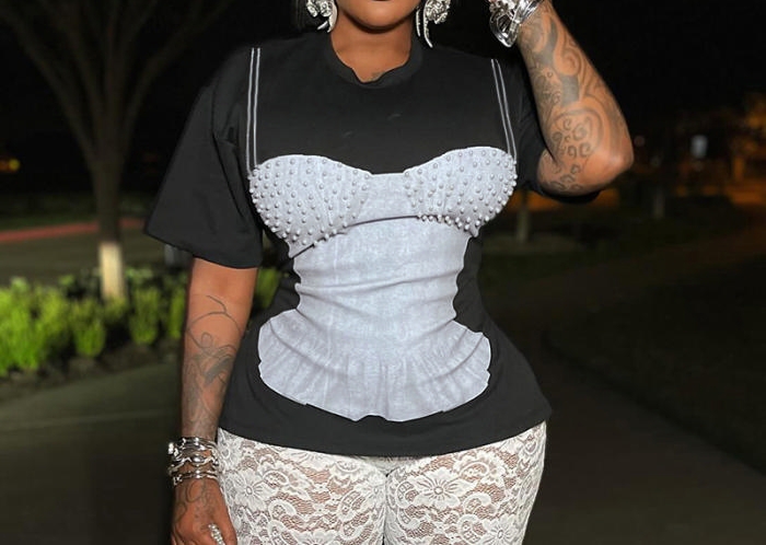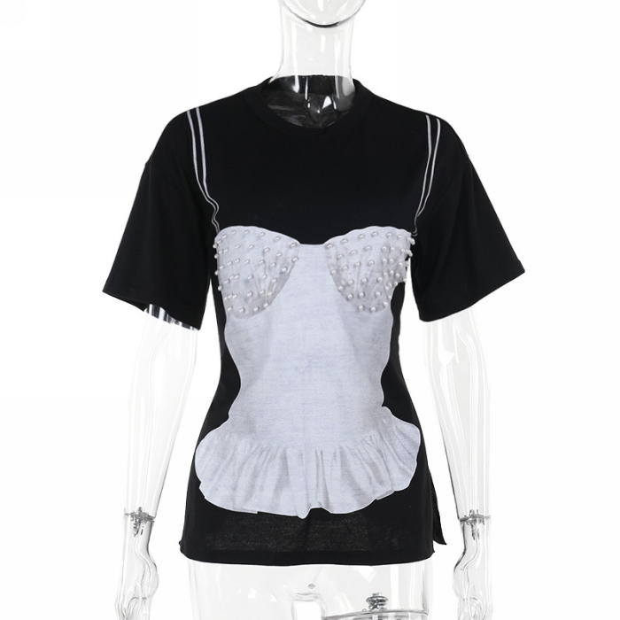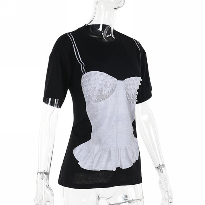 (Real Image,Only Tops)2024 Styles Women Printed Pearl-Accented Waist-Cinching T-Shirt TopSKU: #XF92981-1
