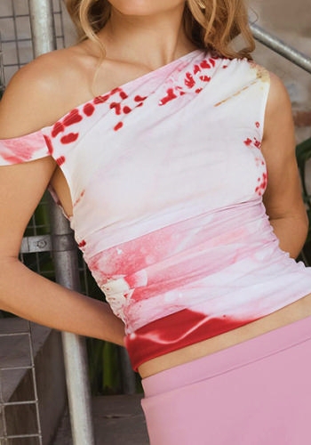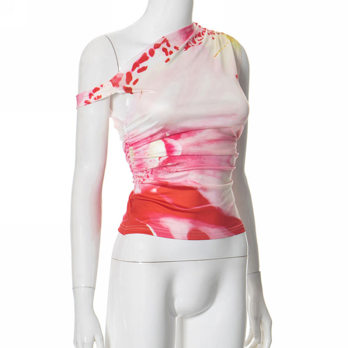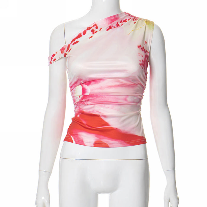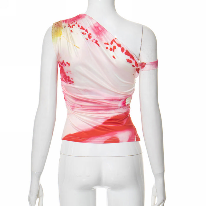 (Real Image,Only Tops)2024 Styles Women Sexy Spice Ombre Print Asymmetrical Slanted Shoulder Pleated TopSKU: #CF92057-1