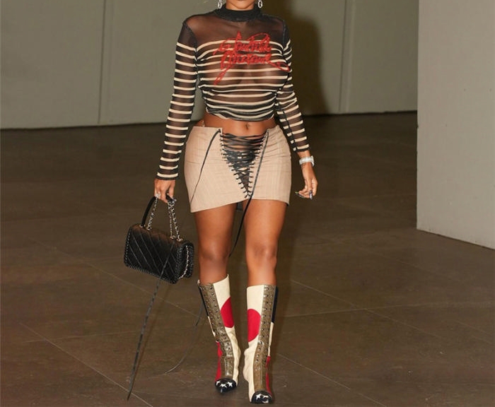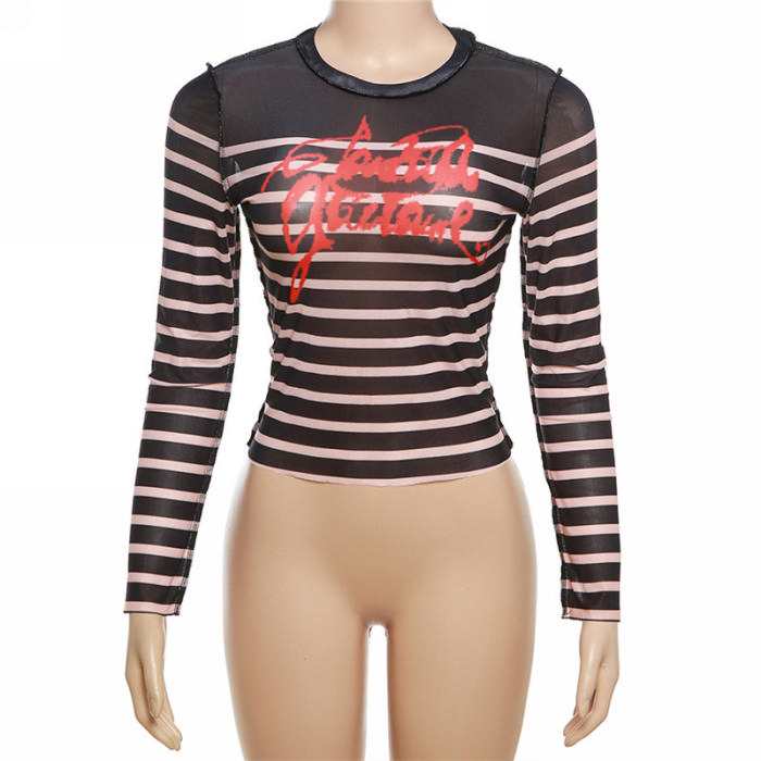 (Real Image,Only Tops)2025 Styles Women Fashion Mesh Digital Print Color-Block Round-Neck Fitted TopSKU: #CF77877-1