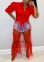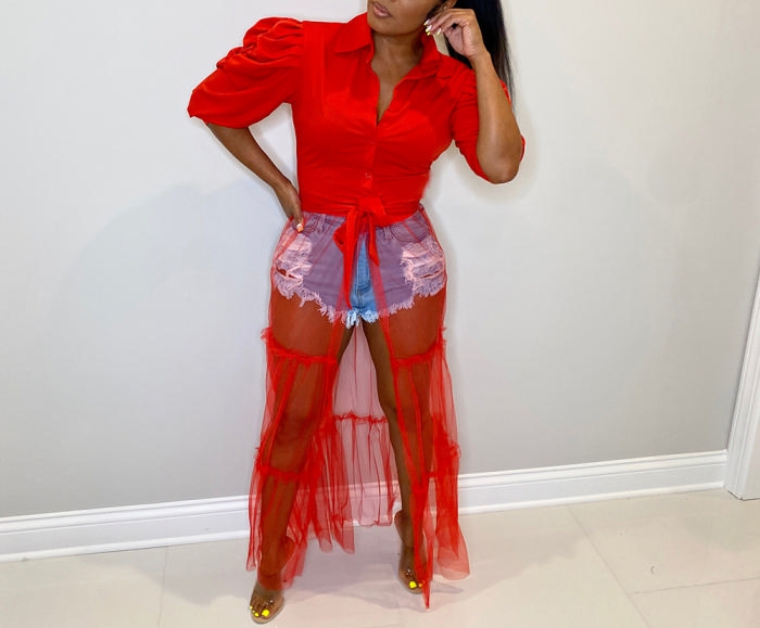 (Red)2022 Styles Women Fashion Summer TikTok&Instagram Styles Mesh Hem Shirts Maxi DressSKU: #XF14901-3