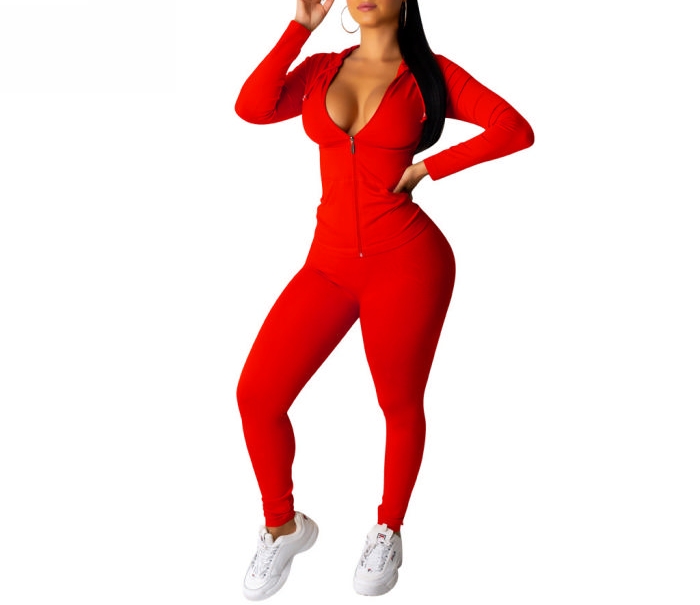 (Red)2022 Styles Women Sexy Spring&Winter TikTok&Instagram Styles Front Zipper Two Piece SuitSKU: #XF13452-2