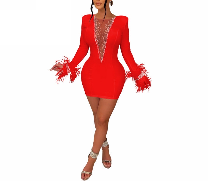 (Red)2022 Styles Women Sexy Spring&Winter TikTok&Instagram Styles Mesh Sequin Long Sleeve Mini DressSKU: #CF79016-3
