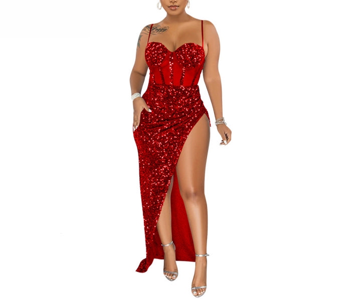 (Red)2023 Styles Women Sexy&Fashion Spring&Summer TikTok&Instagram Styles Sequins Strap High Split Maxi DressSKU: #CF27206-3