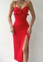 (Red)2024 Styles Women Fashion Sexy Solid Color Ruffle Halter Split Pencil Bodycon Maxi DressSKU: #CF76172-4