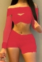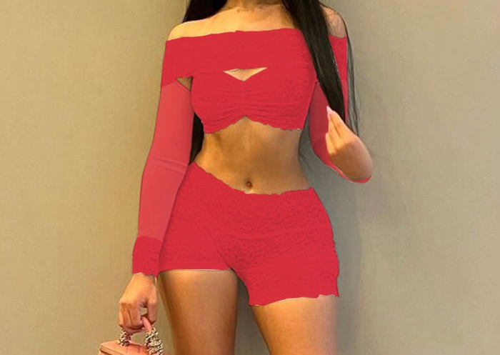 (Red)2024 Styles Women Summer Lace Spliced Off-Shoulder Top and Stretch Shorts Two Piece SetSKU: #CF47932-4