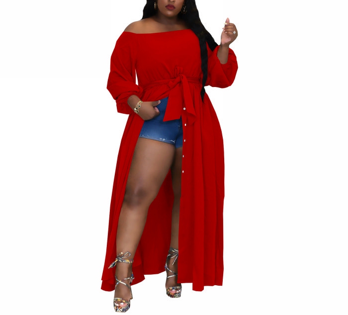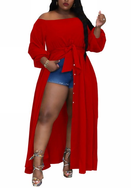 (Red)(Plus Size)2022 Styles Women Fashion Summer TikTok&Instagram Styles Front Button Waist Tie Maxi DressSKU: #XF13438-2