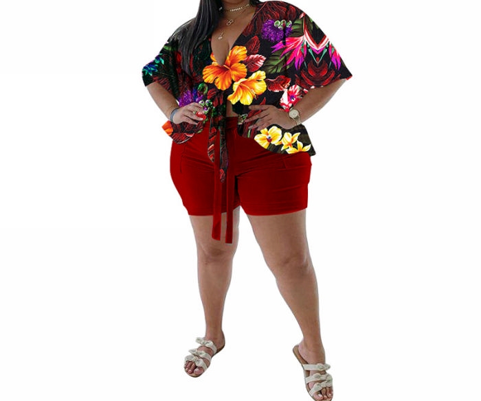 (Red)(Plus Size)2023 Styles Women Sexy&Fashion Spring&Summer TikTok&Instagram Styles Print Short Two Piece SuitSKU: #CF85005-2