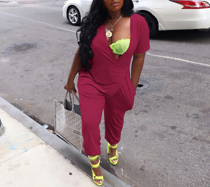 (Rose)2022 Styles Women Fashion Summer TikTok&Instagram Styles Solid Color Loose JumpsuitSKU: #CF71009-5