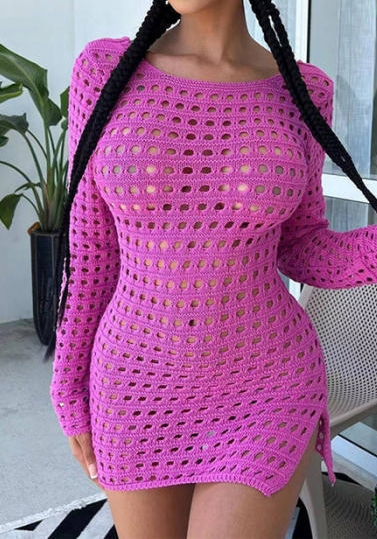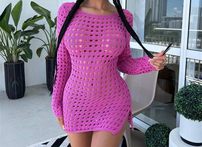 (Rose)2023 Styles Women Sexy&Fashion Spring&Summer TikTok&Instagram Styles Hollow Long Sleeve Mini DressSKU: #CF77279-2