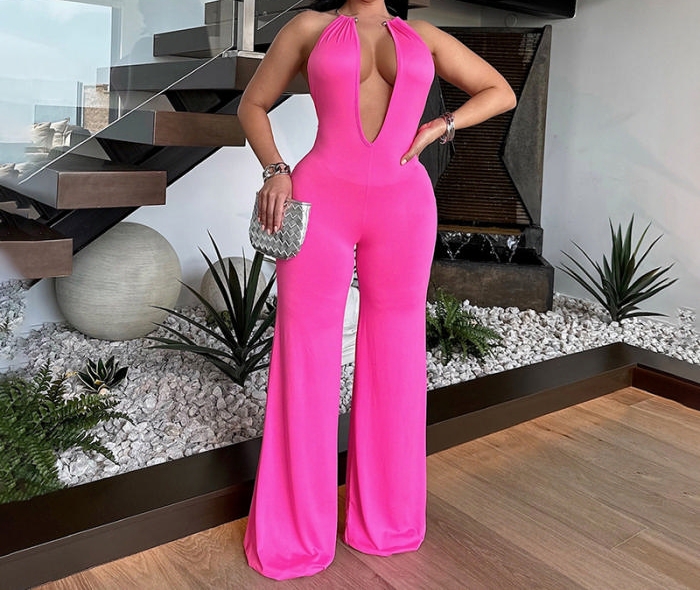 (Rose)2024 Styles Women Multicolor Wave Deep-V Exposed Back High-Waisted JumpsuitSKU: #CF92067-4