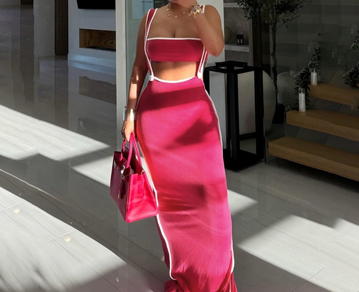(Rose)2024 Styles Women Summer Fashion Sexy Halter Crop Top Open-Work Slim Maxi DressSKU: #CF83311-3