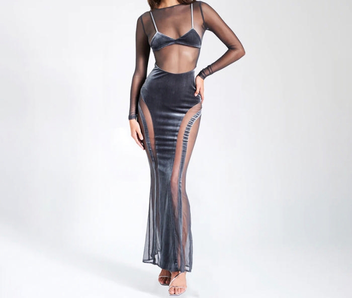 (Silver)2023 Styles Women Sexy&Fashion Autumn/Winter TikTok&Instagram Styles Mesh Long Sleeve Maxi DressSKU: #XF62649-2