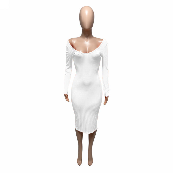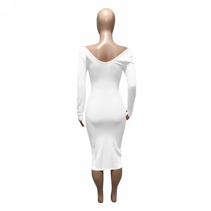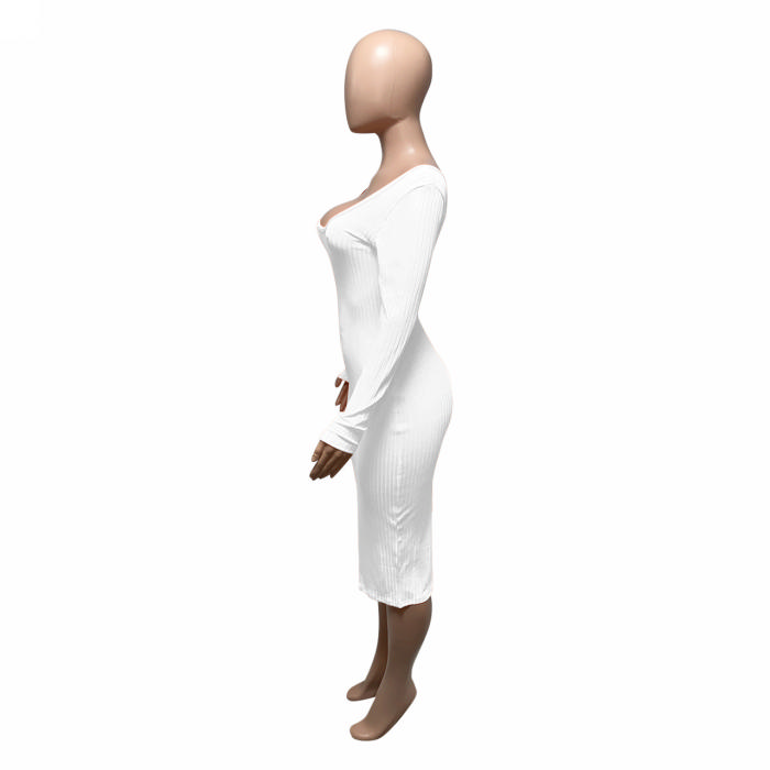 (White)2022 Styles Women Fashion Spring&Winter TikTok&Instagram Styles Solid Color Long Sleeve Midi DressSKU: #XF82071-1