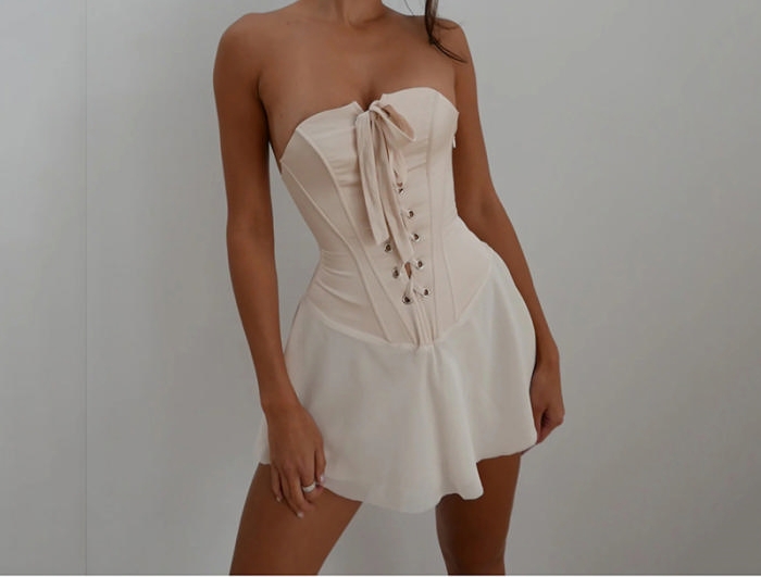 (White)2022 Styles Women Fashion Spring&Winter TikTok&Instagram Styles Tube Lace Up Hem Mini DressSKU: #XF62582-1