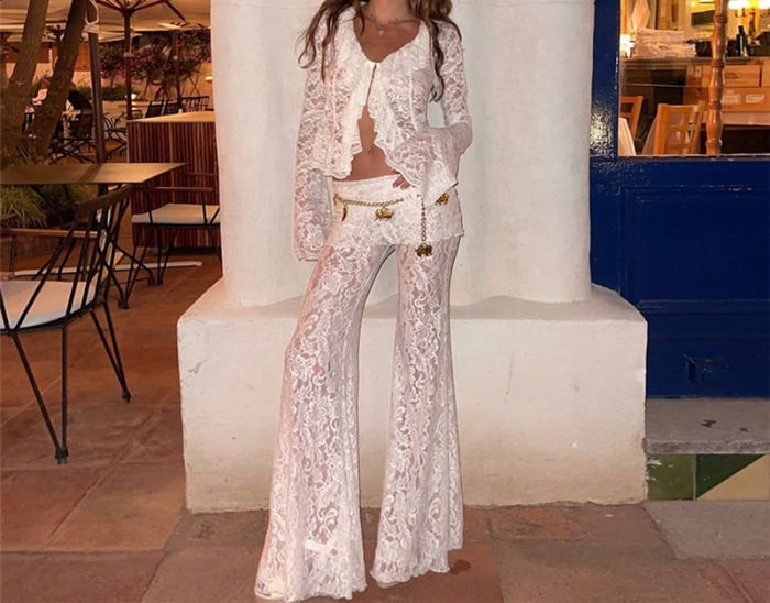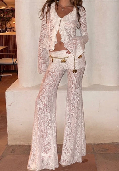 (White)2024 Styles Women Autumn/Winter Sexy Sheer Long Sleeve Cardigan & High-Waist Flared Pants SetSKU: #CF77862-2