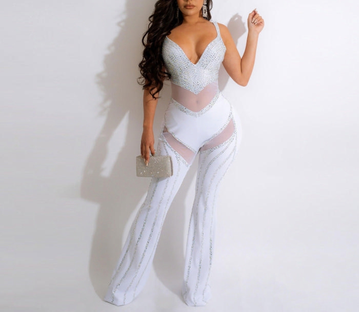 (White)(Plus Size)2022 Styles Women Fashion Spring&Winter TikTok&Instagram Styles Sequin Strap JumpsuitSKU: #XF27269-1