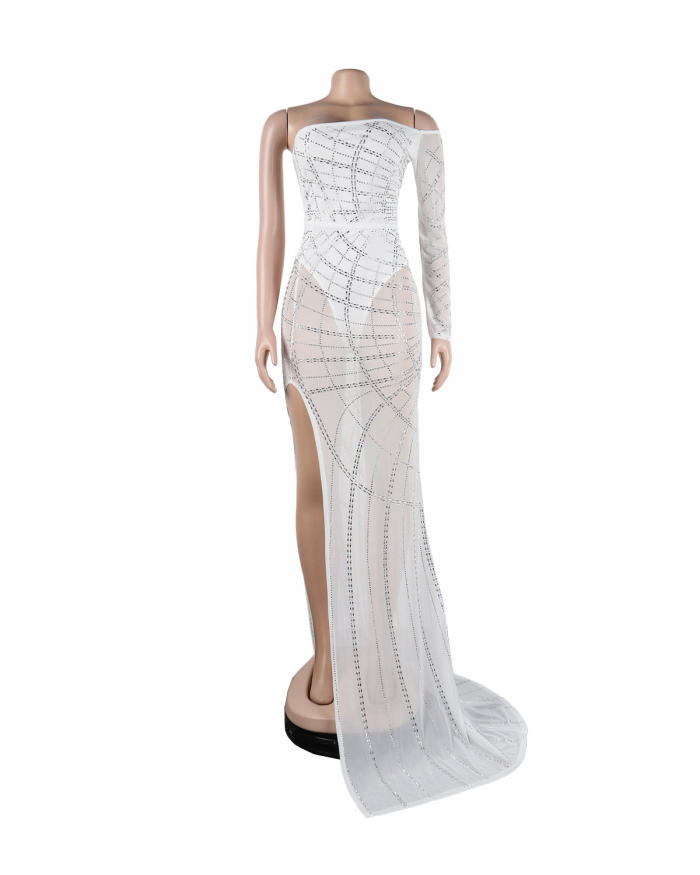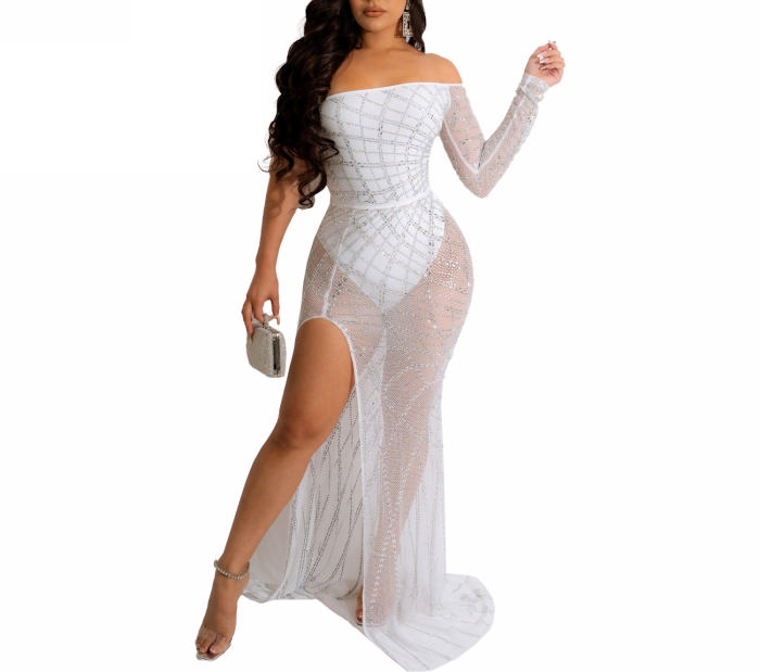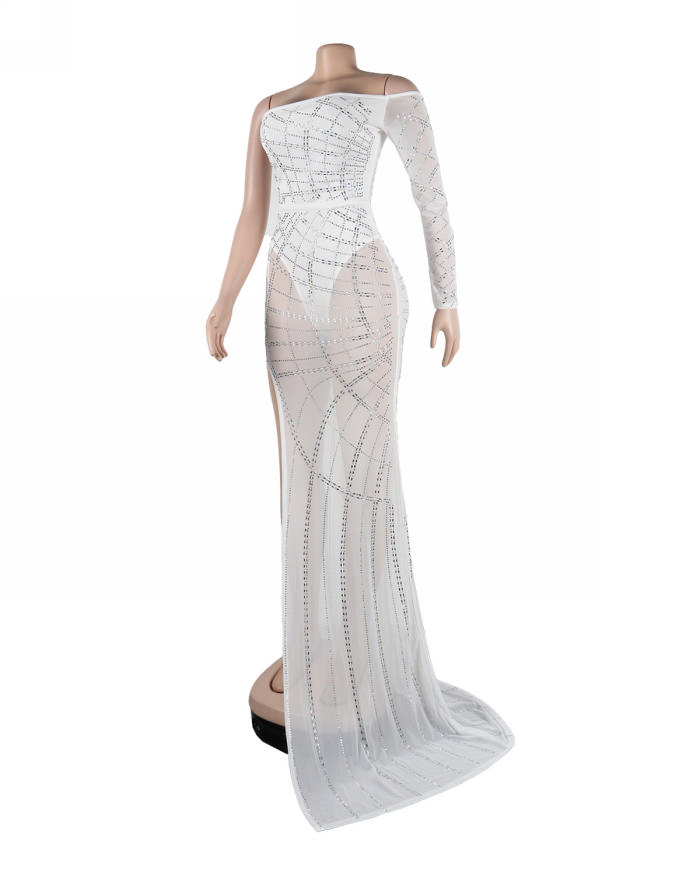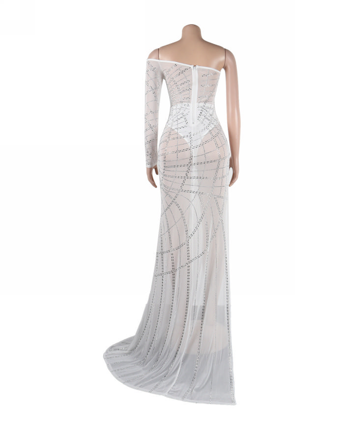 (White)(Plus Size)2022 Styles Women Fashion Spring&Winter TikTok&Instagram Styles Single Shoulder Sequin Maxi DressSKU: #XF27254-2