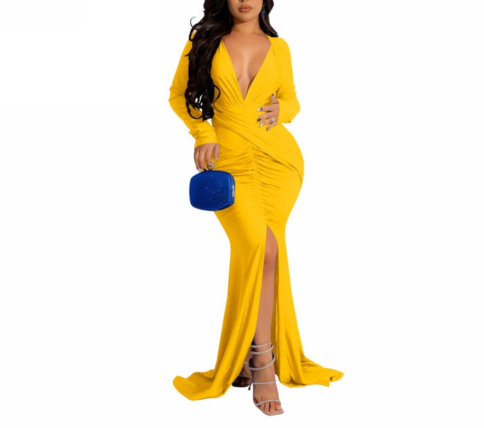 (Yellow)2022 Styles Women Sexy Spring&Winter TikTok&Instagram Styles Cross V Neck Long Sleeve Maxi DressSKU: #CF79020-8
