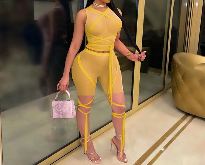 (Yellow)2022 Styles Women Sexy Spring&Winter TikTok&Instagram Styles Mesh Short Two Piece SuitSKU: #TP027-2